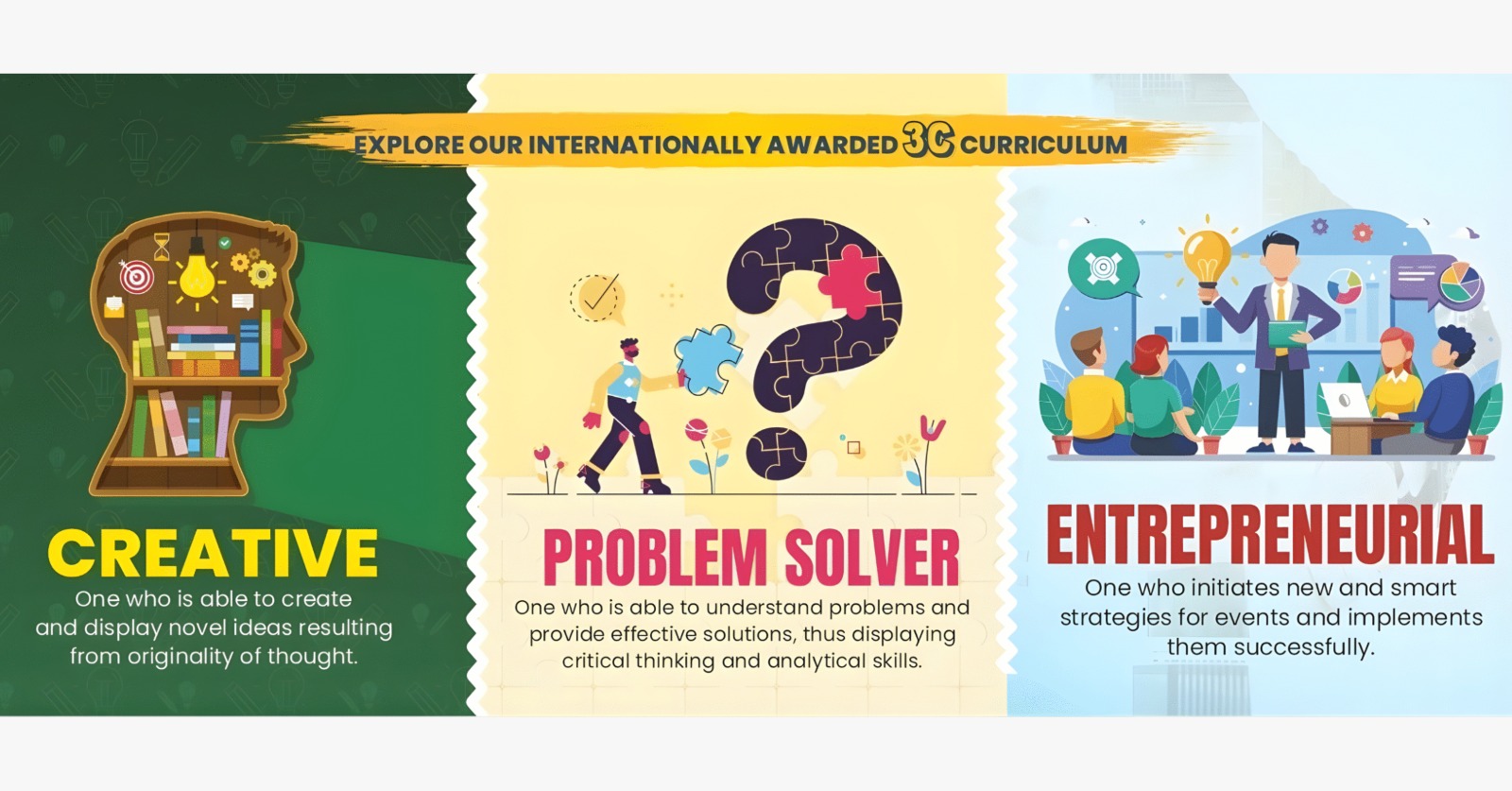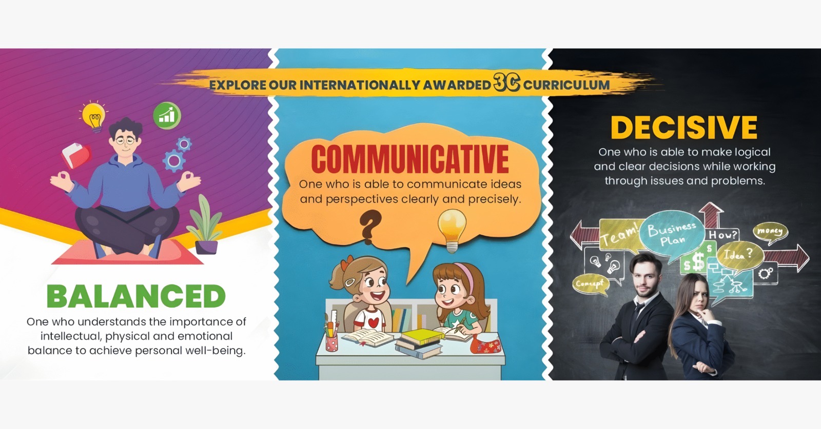 The 3C Curriculum—Character, Competence, and Content—focuses on holistic learning by blending academic excellence with life skills and values. It encourages inquiry, creativity, and critical thinking through experiential and student-centered methods. This balanced approach nurtures well-rounded, confident learners equipped with knowledge, skills, and strong values for real-world success.
